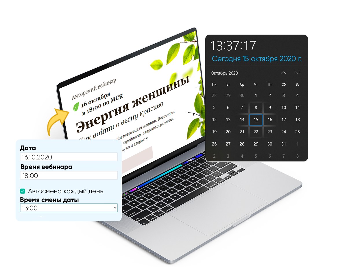 • Примеры использования: Например, можно установить автоматическую смену за два часа до начала ближайшего вебинара или показывать дату на следующий день после каждого вебинара.