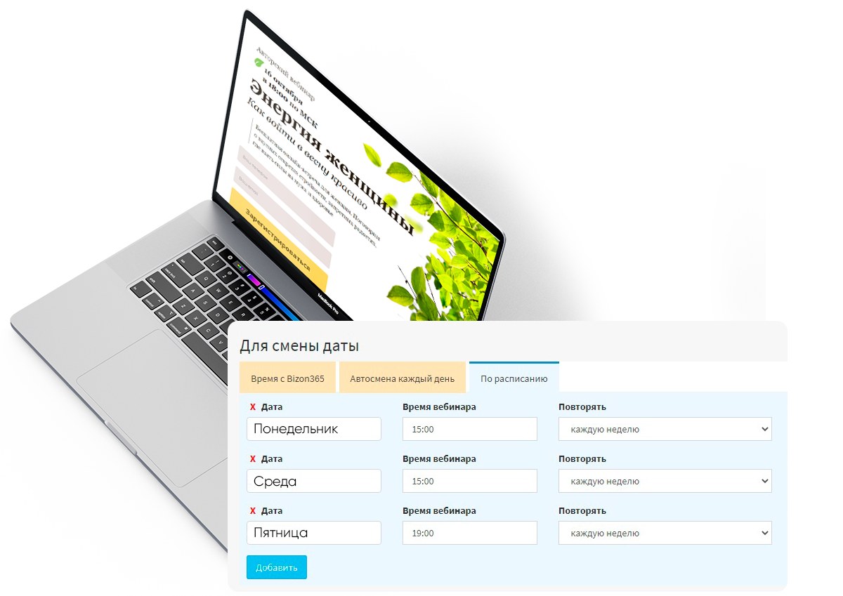 • Сложное расписание: Возможность установить смену даты в соответствии с индивидуальным графиком вебинаров, например, в понедельник, вторник и пятницу, или каждые три дня.