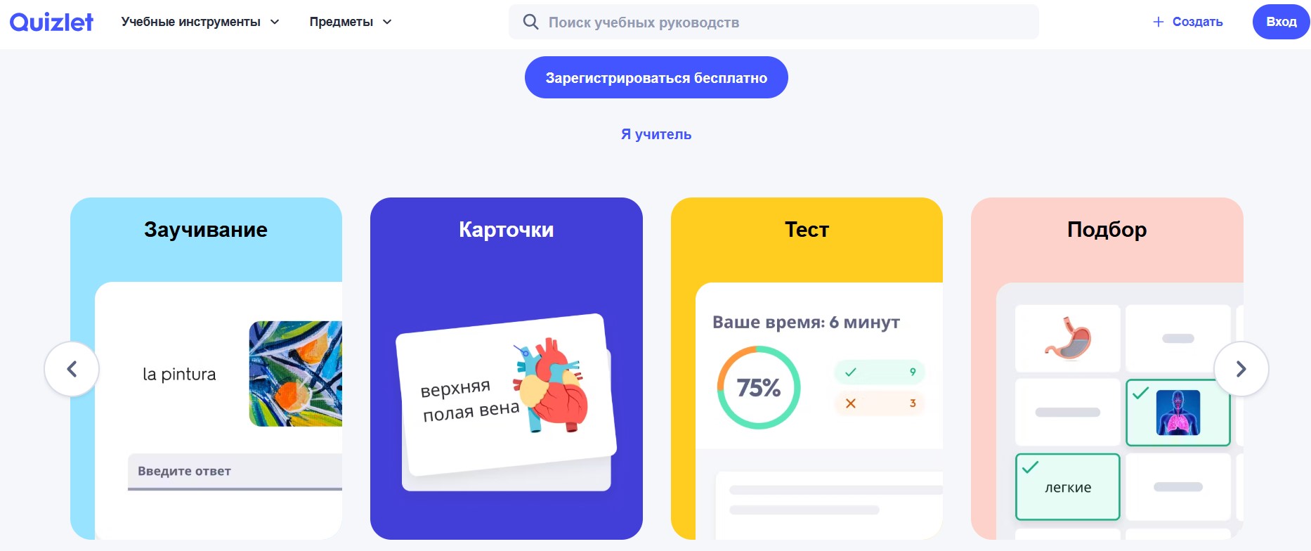 Quizlet – один из самых известных сервисов для создания учебных флеш-карт и игр. С его помощью можно делать наборы терминов с определениями, которые ученики будут учить через разные режимы: классические флеш-карточки, тесты, игры на соответствие и т.д.