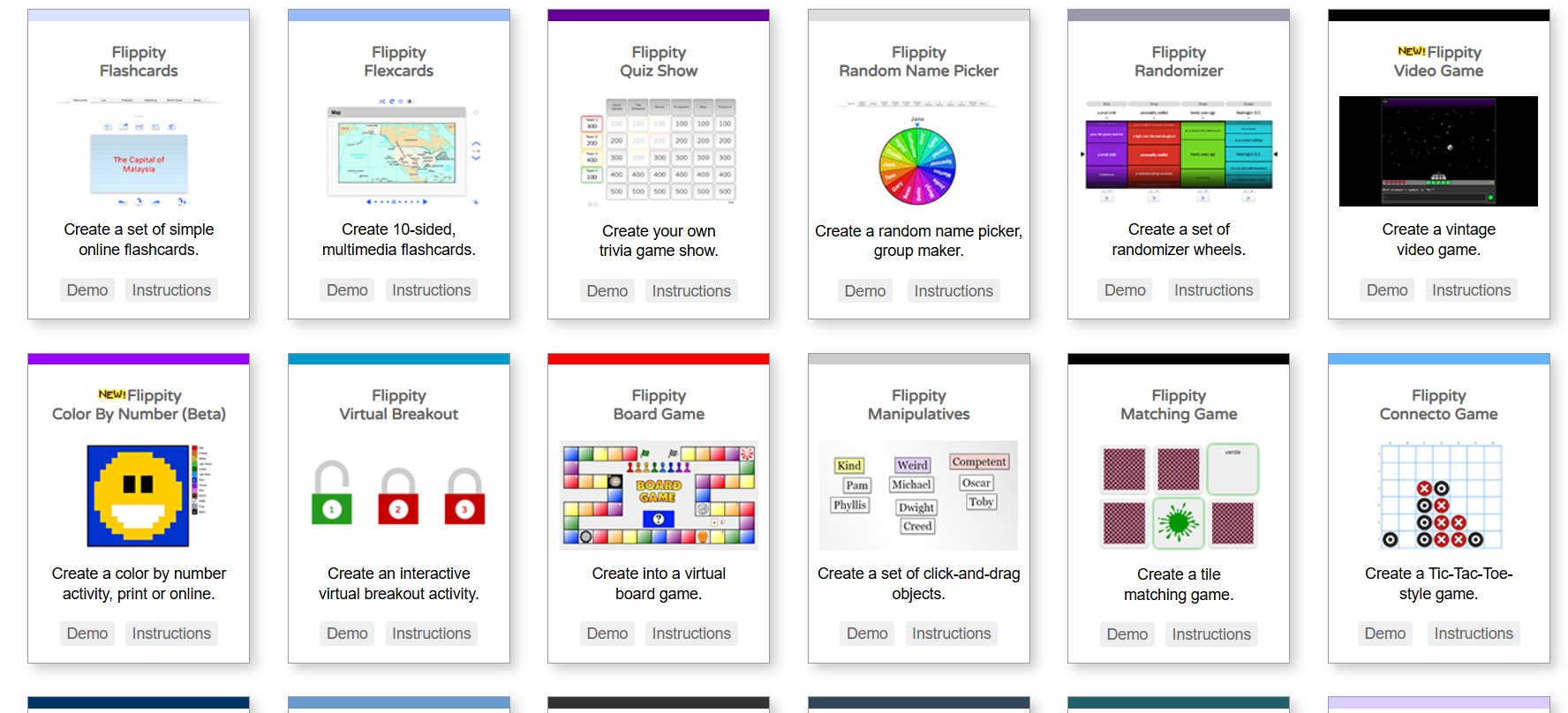 Flippity – необычный, но очень полезный инструмент, представляющий собой набор шаблонов на базе Google Таблиц. По сути, Flippity превращает электронные таблицы в образовательные игры и упражнения. На сайте Flippity доступно множество шаблонов: флеш-карточки, викторина в стиле Jeopardy, список случайных пар / команд, спиннер (колесо фортуны), бинго, кроссворд, таблица результатов и многое другое.