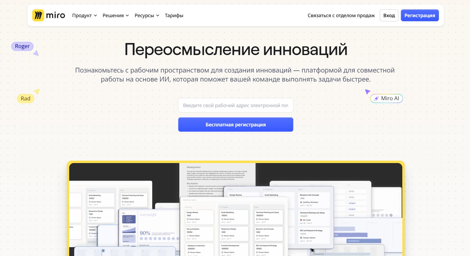 Популярный онлайн-доска для совместной работы, широко используемая и в бизнесе, и в образовании. Представьте бесконечный чистый лист, на котором можно размещать стикеры, текст, изображения, рисовать от руки, строить схемы – и всё это могут делать одновременно несколько человек. Miro предоставляет богатый набор элементов (фигуры, стрелки, диаграммы) и шаблонов. Для образовательных целей Miro ценна как платформа для мозговых штурмов, маппинга идей, создания майндмэпов, совместного планирования проектов.