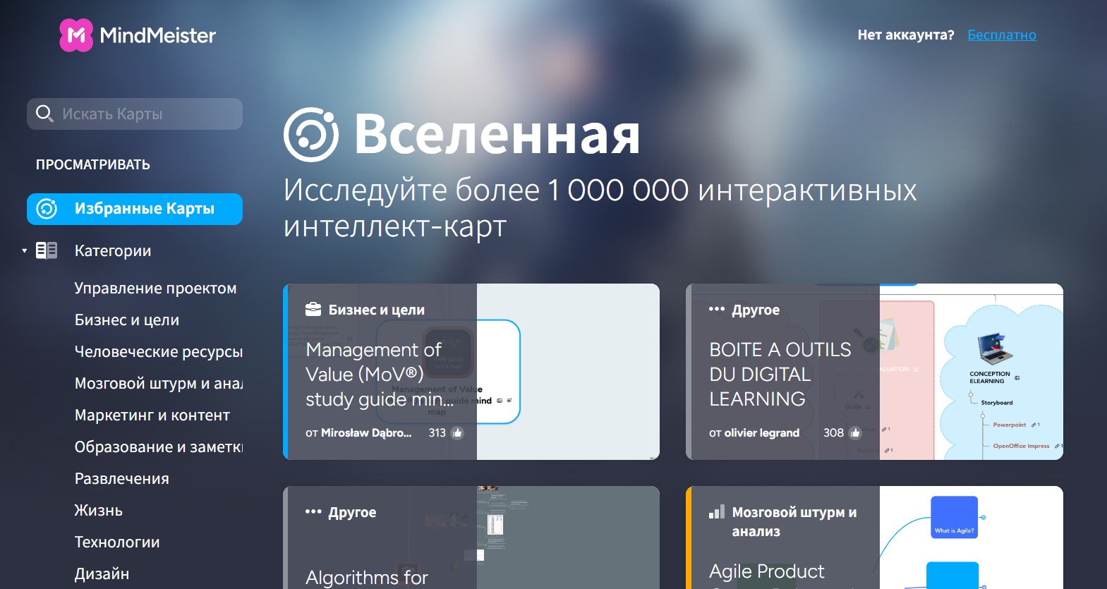 Специализированный сервис для создания интеллект-карт (mind maps). Он позволяет визуально структурировать информацию в виде древовидной схемы: центральная тема, от нее отходят ветви-подтемы, от тех – еще ветви и т.д.