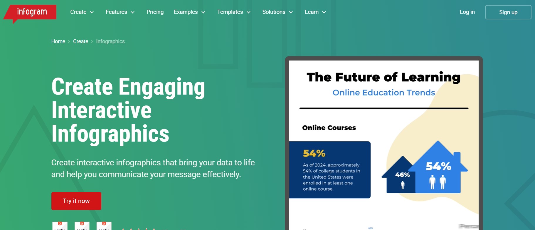 Платформа для создания инфографики и визуализации данных. С ее помощью методисты могут превращать сухие данные и тексты в яркие диаграммы, графики, интерактивные карты и лонгриды. Сервис удобен тем, что предоставляет готовые шаблоны дизайна: выбираете шаблон отчета или плаката, заполняете своими цифрами и текстами – и получаете привлекательную инфографику. Infogram поддерживает интерактивные элементы: например, можно сделать график, где при наведении курсора отображаются точные значения (hover-инфо), или карту, где клики по регионам показывают показатели.
