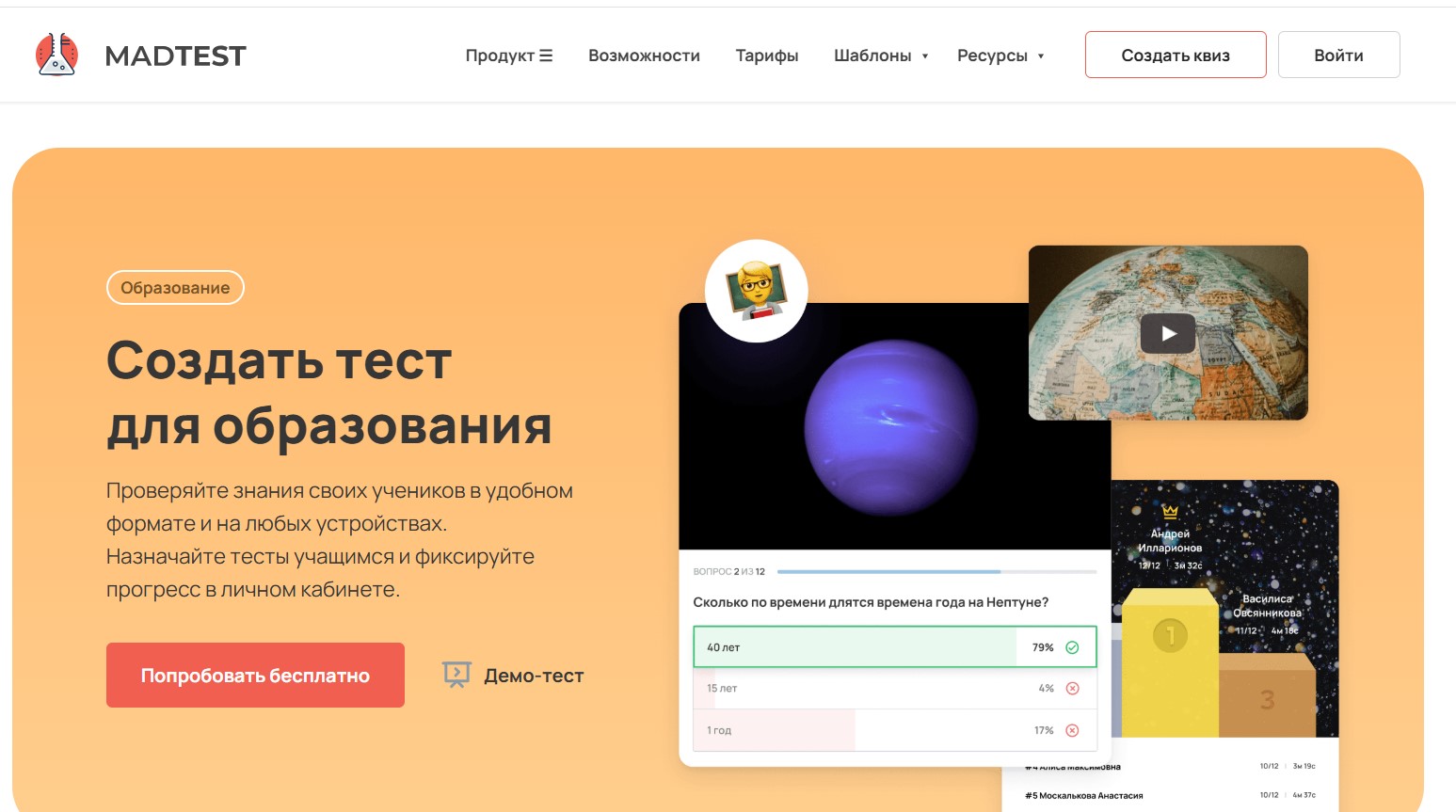 Онлайн-сервис для создания тестов и квизов. В русскоязычном сегменте он известен как еще одно решение для интерактивных тестирований. По функционалу MadTest схож с OnlineTestPad и другими генераторами тестов.