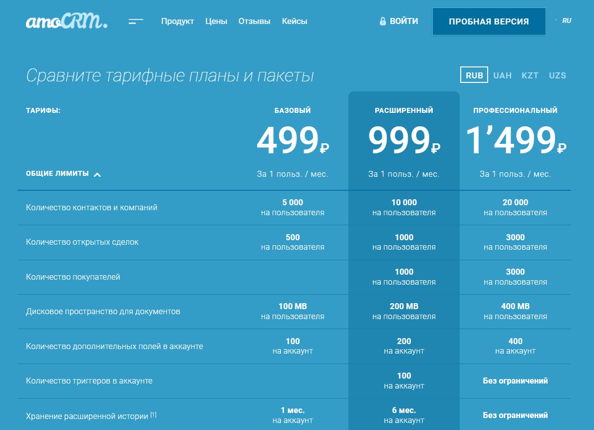amoCRM предлагает три основных тарифных плана, адаптированных под разные потребности онлайн-школ: