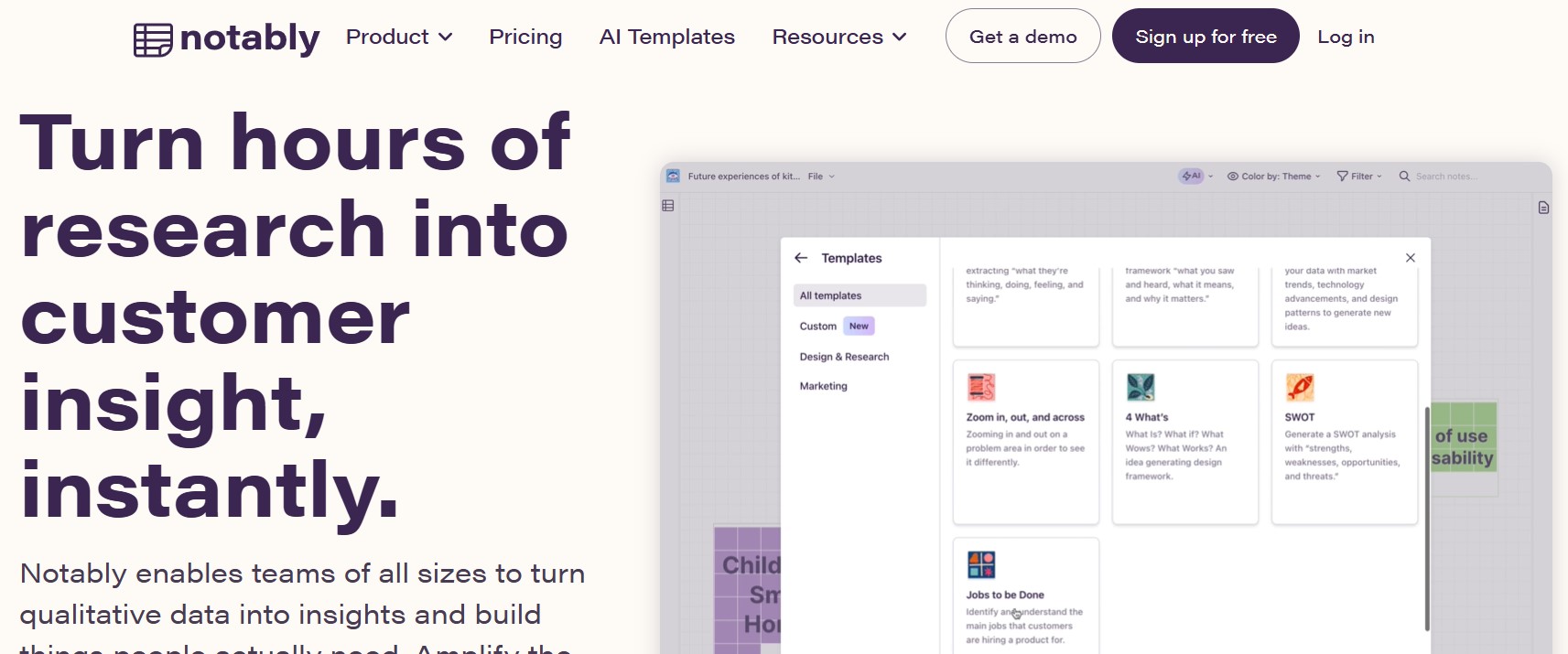- Notably – платформа для UX-исследований с AI. Автоматически транскрибирует встречи, выделяет инсайты и кластеризует заметки, ускоряя анализ обратной связи .