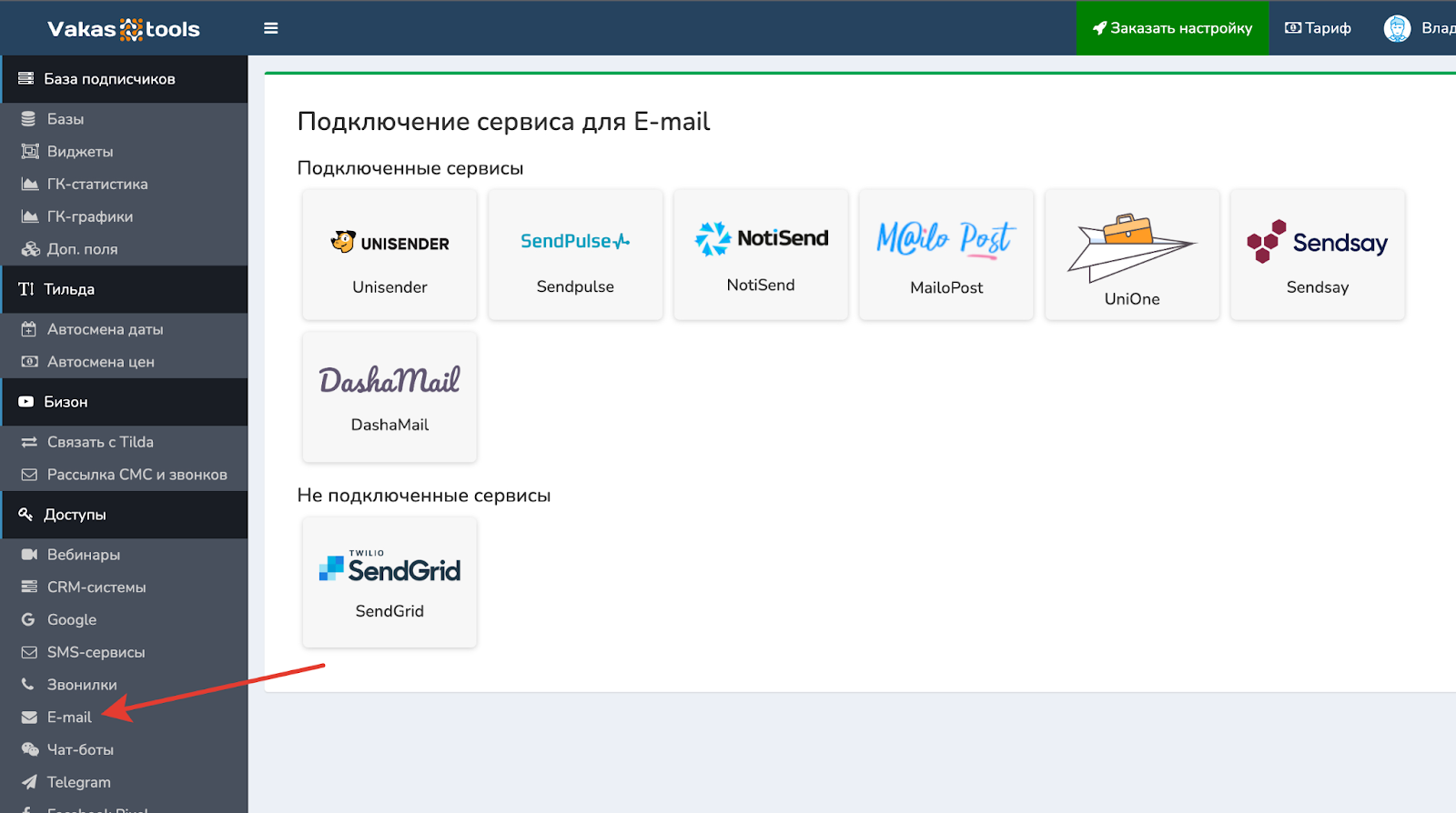 В первую очередь стоит определиться с email-сервисом, через который вы будете работать и подключить его в доступах.