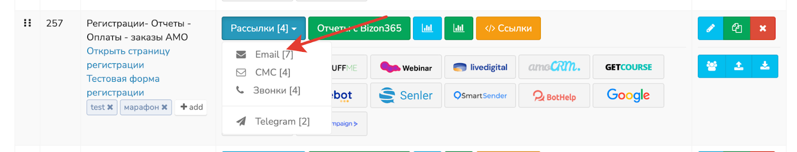 Зайти в Базу, по которой вы будете рассылать рассылку и выбрать в меню Email.