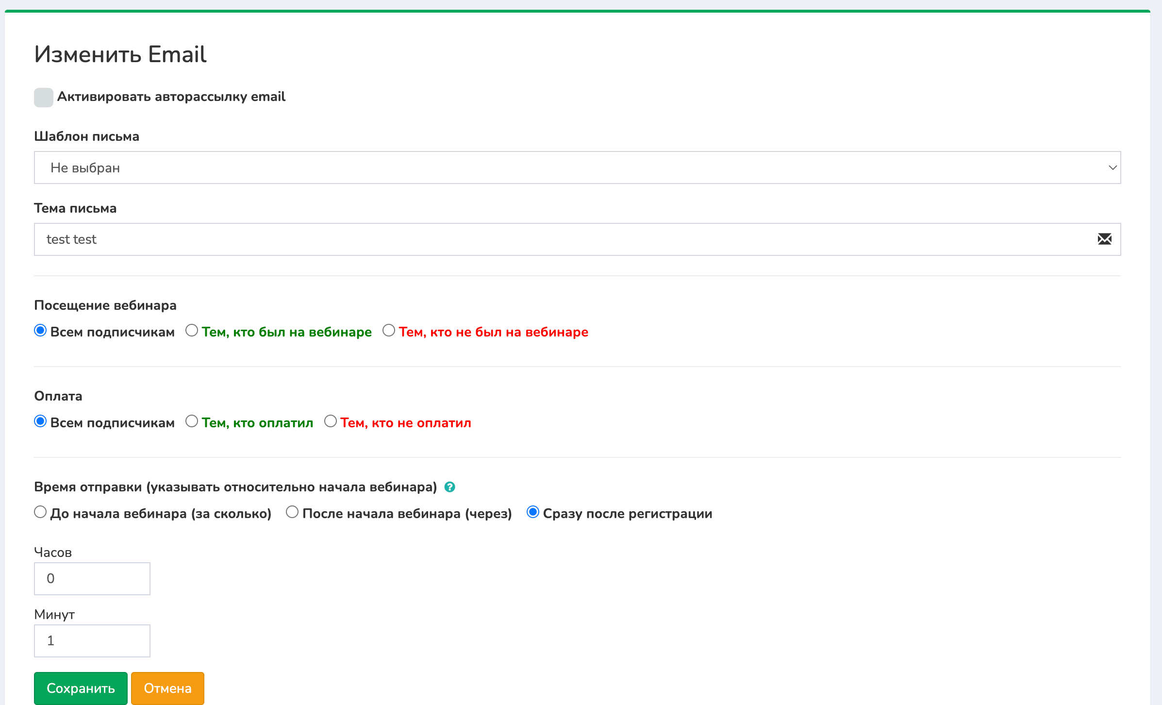 Шаблон письма подтягивается автоматически, время отправки указывается относительно начала вебинара. И не забыть активировать галочку «Активировать авторассылку email». И все, ваши письма будут уходить относительно расписания вебинаров, которое вы указали в сервисе.