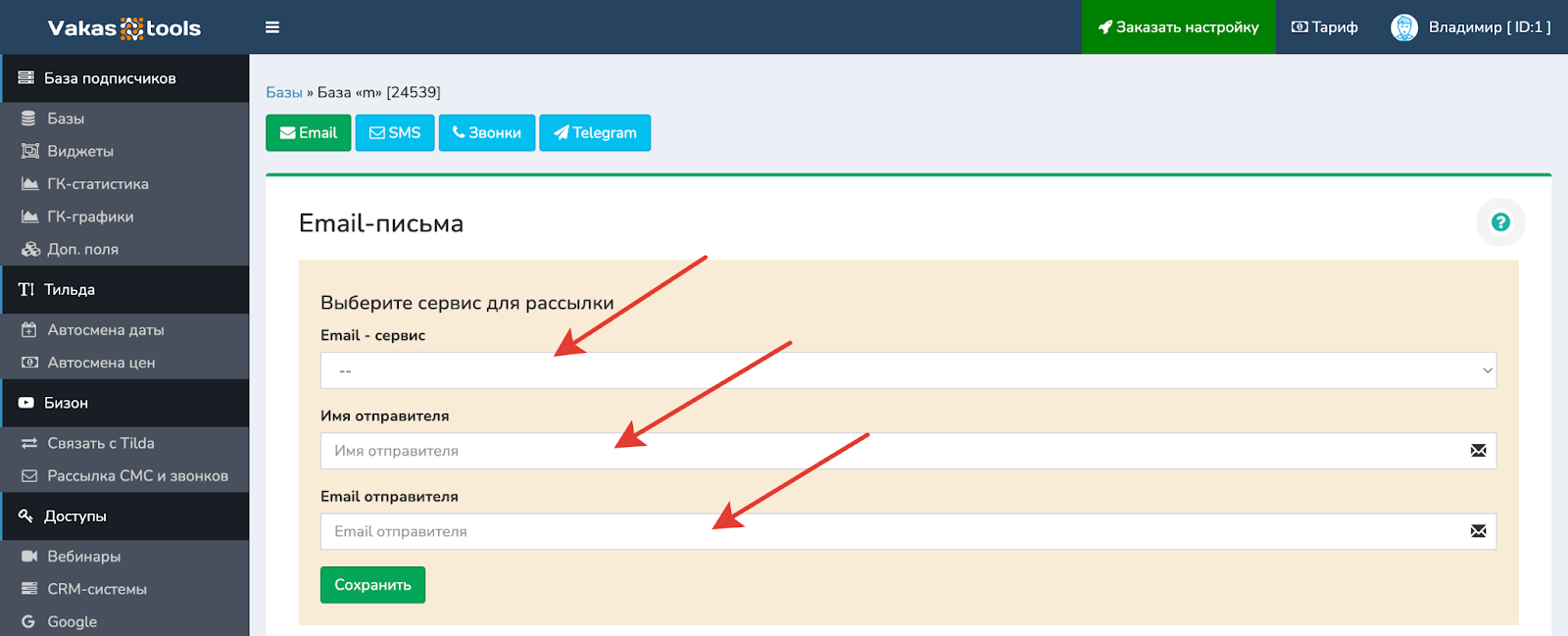 Выбрать сервис, через который будет осуществляться рассылка, прописать Имя и Email отправителя. Имя и Email отправителя задается в email сервисе. Email отправителя обязательно должен быть подтвержден.