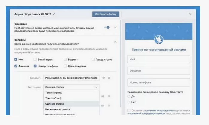 В рекламной форме ВКонтакте были поля с выбором (например, тип квартиры – однокомнатная, двухкомнатная и т. д.).