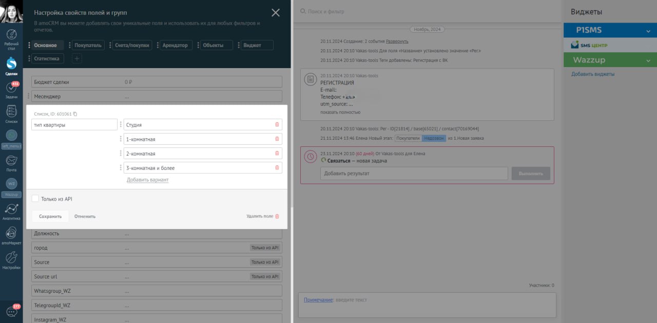 В amoCRM заранее создали дополнительные поля для хранения этих данных.