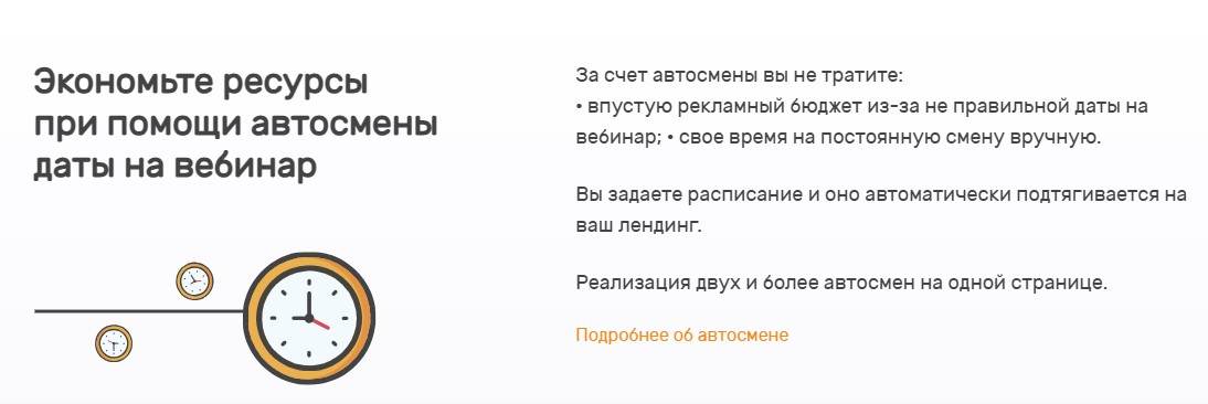 Если вы проводите серию вебинаров, не нужно вручную обновлять даты – задайте расписание, и система автоматически обновит информацию на странице. А чтобы сэкономить свое время и рекламный бюджет, воспользуйтесь функцией автосмены даты на лендинге от Vakas-tools. Более того, если вы планируете проводить несколько мероприятий, на одной странице можно настроить несколько автосмен.