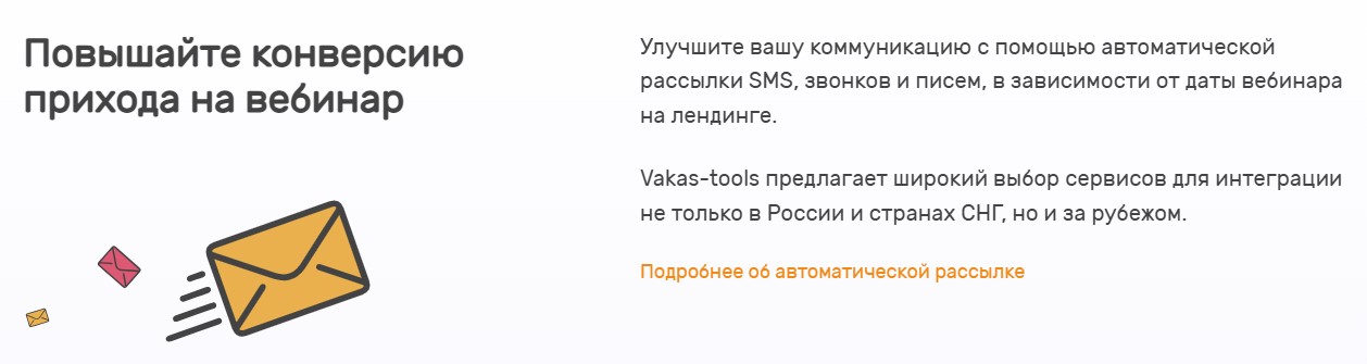 Главное в день вебинара – сосредоточиться на своём выступлении. Позвольте Vakas-tools позаботиться обо всём остальном. Благодаря автоматизации управления регистрациями, отправки напоминаний и сбора аналитики, вы сможете полностью погрузиться в подготовку контента и взаимодействие с аудиторией. Vakas-tools обеспечит автоматическую смену дат на лендинге, организует персонализированные рассылки участникам до и после вебинара, а также соберёт важную статистику по посещаемости и вовлеченности. Ваша уверенность и энергия, подкрепленные надежной автоматизацией процессов, создадут атмосферу, которая сделает вебинар по-настоящему незабываемым и эффективным!