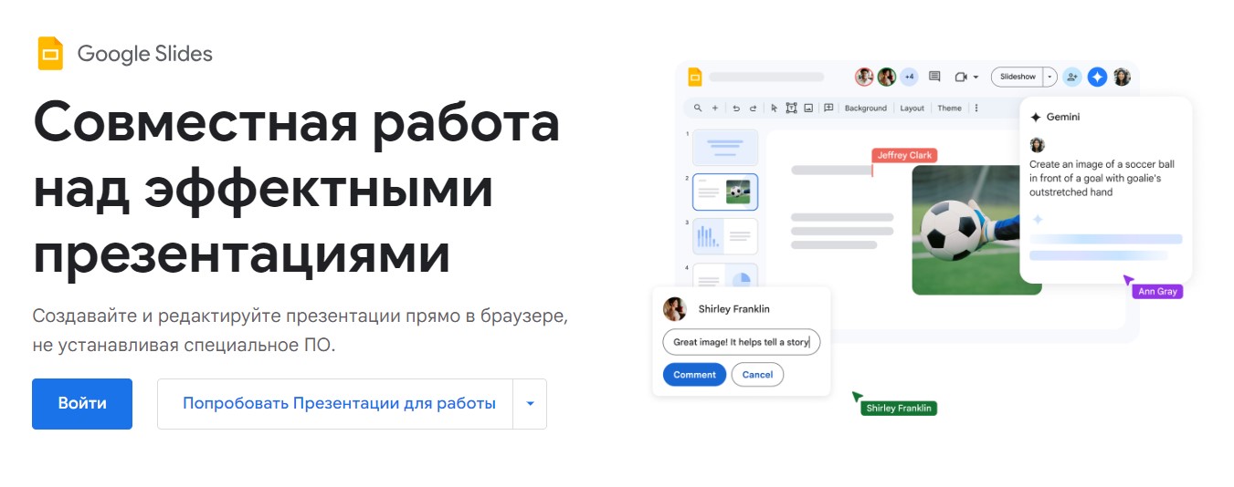 Это бесплатная онлайн-платформа для создания презентаций, которая является частью Google Workspace. Одним из ключевых преимуществ Google Slides является возможность совместного редактирования, что делает его идеальным для командных проектов. Платформа также позволяет сохранять презентации в формате PowerPoint, что упрощает их использование в оффлайн-режиме.