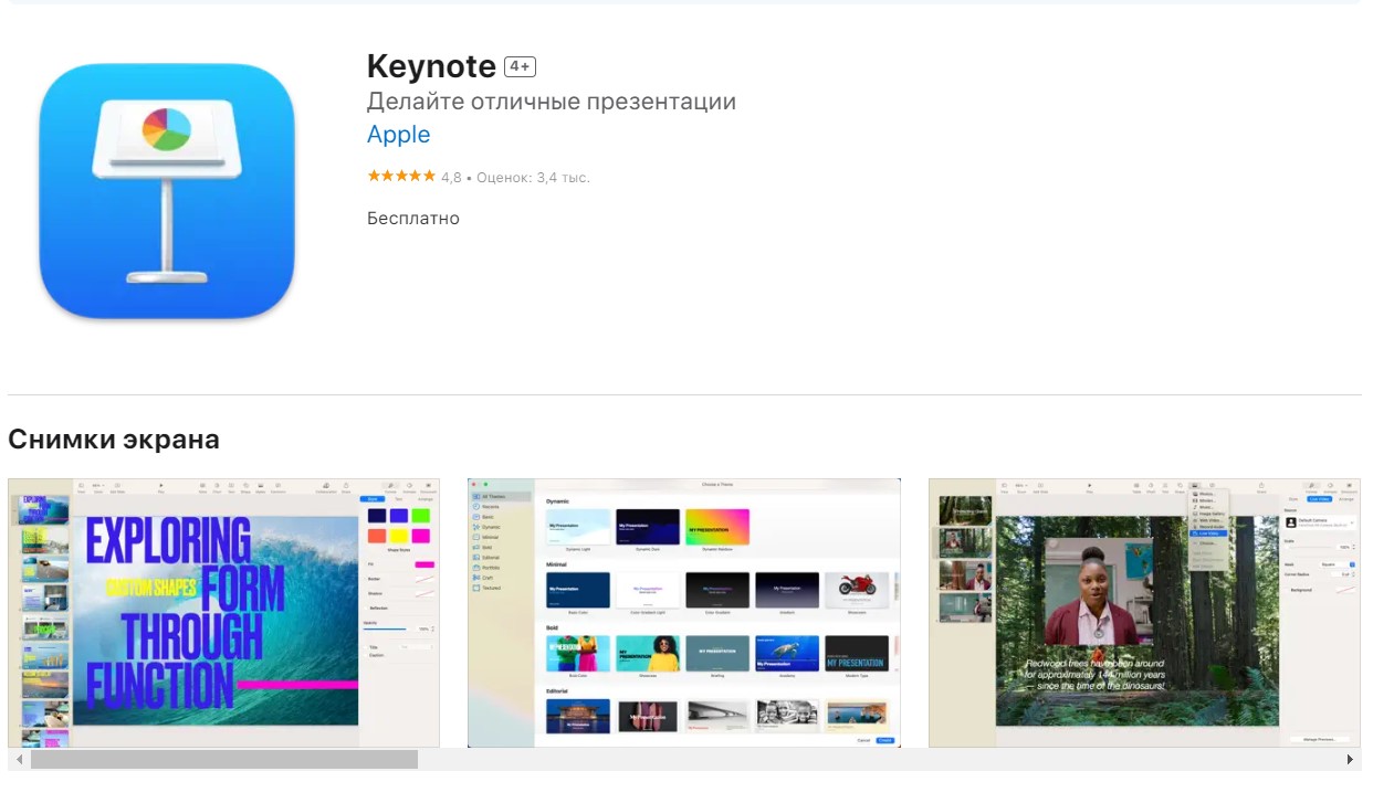Это инструмент для создания презентаций, разработанный Apple. Он особенно популярен среди пользователей экосистемы Apple благодаря своей глубокой интеграции с другими продуктами компании. У Keynote есть богатый выбор шаблонов, кинематографических переходов и уникальных функций, например, анимация объектов и возможность управления презентацией с помощью Apple Watch.