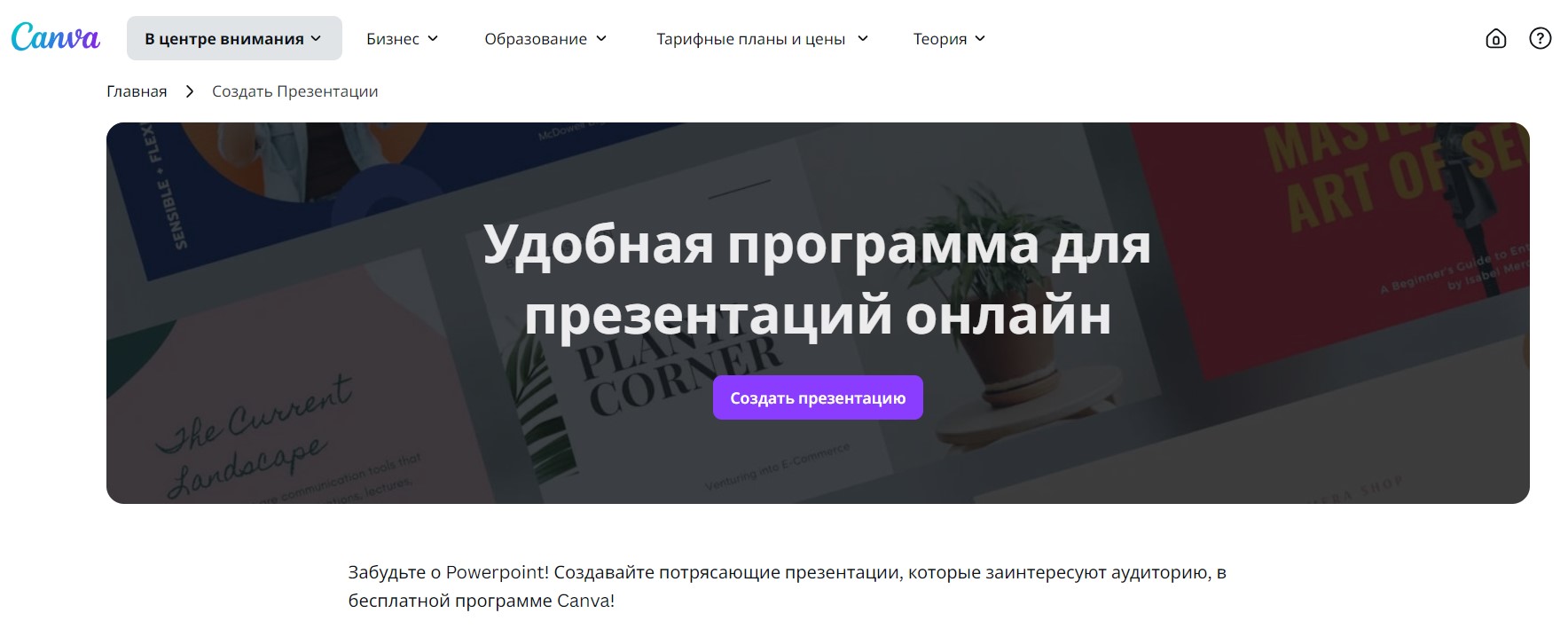 Это облачная платформа, которая позволяет создавать не только презентации, но и широкий спектр графических материалов, включая постеры, инфографику и социальные медиа-посты. Даже несмотря на текущие ограничения по доступу и оплате для пользователей из России (пользоваться сервисом можно только через VPN, а оплачивать – только иностранной картой), Canva остается популярным инструментом благодаря интуитивно понятному интерфейсу и богатой библиотеке шаблонов.