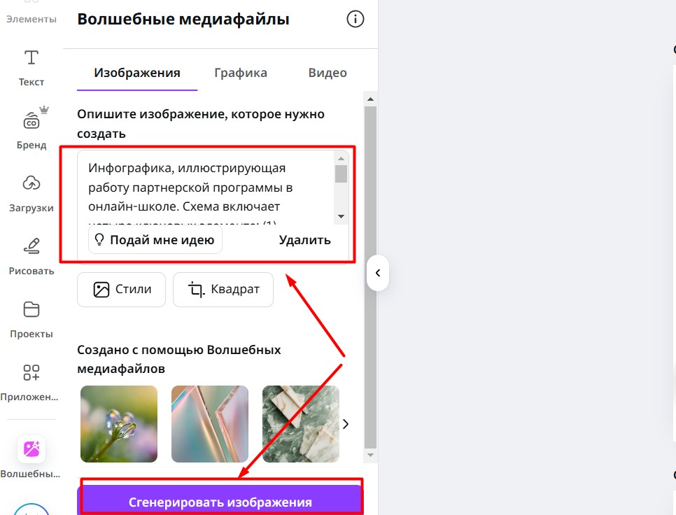 Canva: введите текст в готовые шаблоны. Canva также предлагает функцию генерации дизайна с помощью ИИ — достаточно описать, что вы хотите видеть.