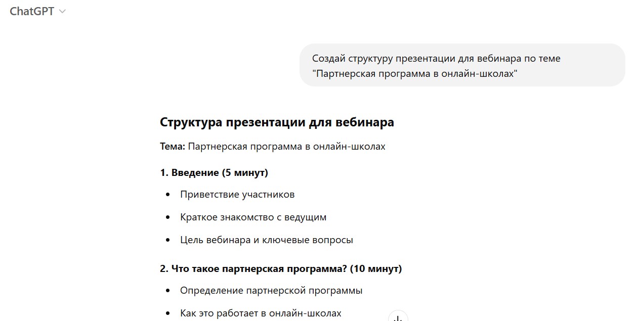 ChatGPT или другие AI-ассистенты: составьте запрос, например, "Создай структуру презентации для вебинара по теме [ваша тема]" или "Напиши текст для слайда о преимуществах онлайн-курсов."