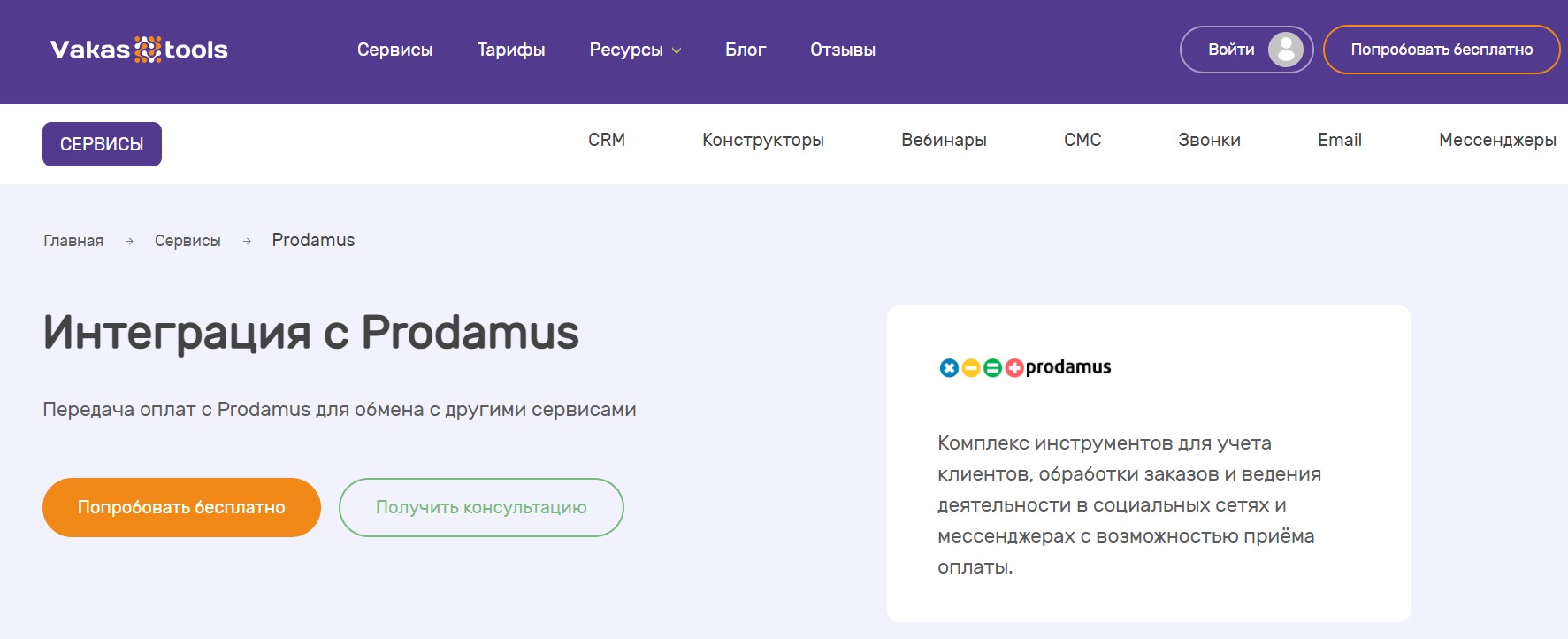 Продамус стал популярен преимущественно в нише инфобизнеса, поэтому для достижения большей автоматизации и интеграции платежной системы со всеми популярными инструментами для онлайн-школ стоит использовать Vakas-tools. Этот интегратор позволяет создать комплексную IT-экосистему, в которой нуждаются компании любого масштаба.