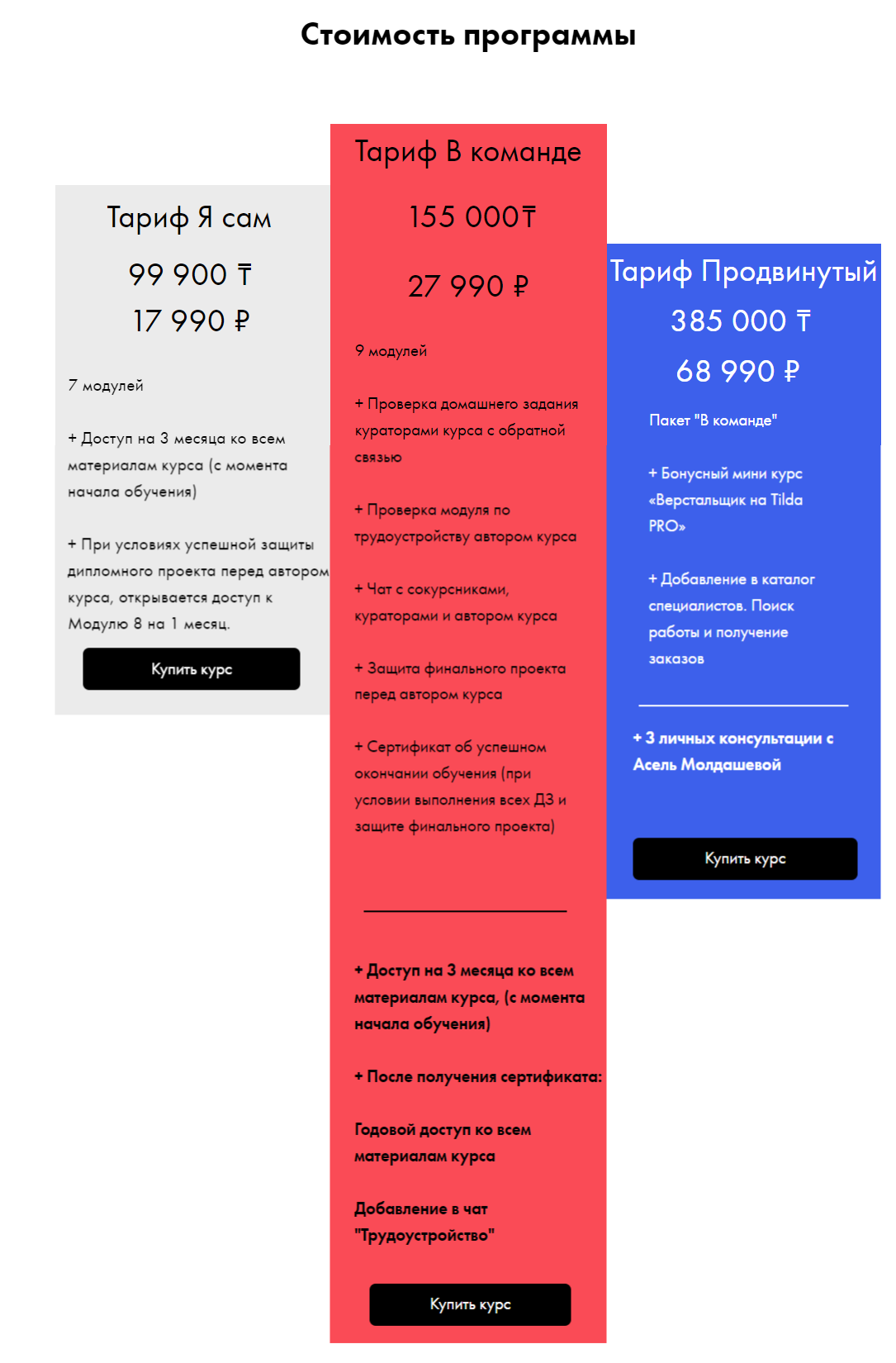 На курсе предлагаются 3 тарифа: “Я сам”, “В команде” и “Продвинутый”. Обратную связь можно получить только на последних 2х.