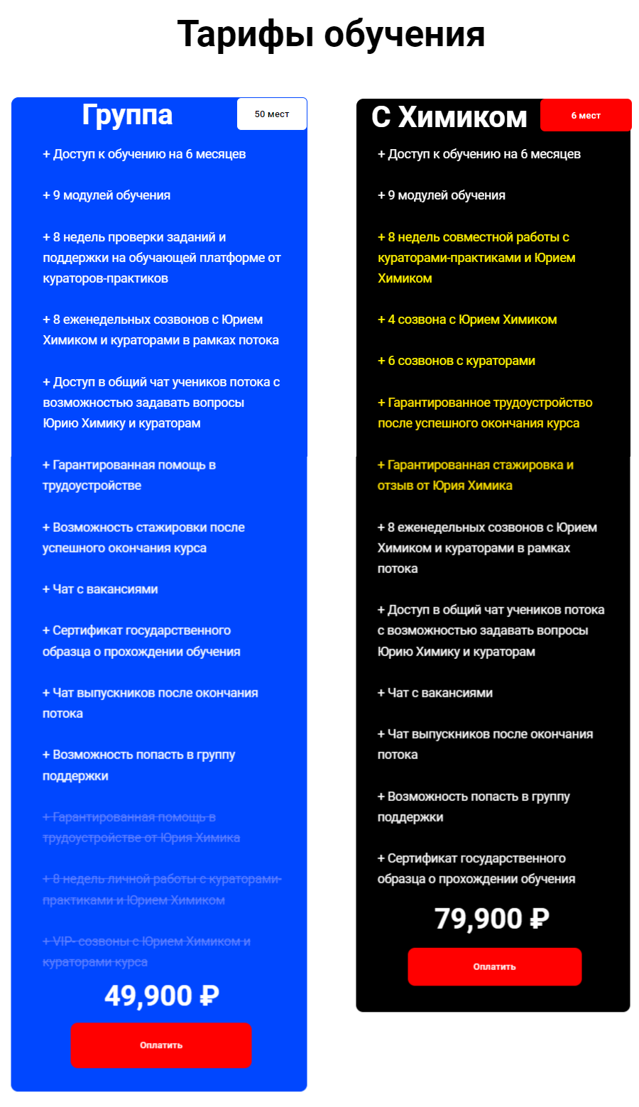 Стоимость курса зависит от тарифа: групповой обойдется вам в 49,900 руб., а персональная работа в тарифе “с Химиком” - 79,900 руб.