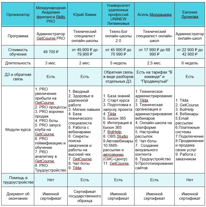 Более подробное описание курсов вы можете посмотреть в таблице: