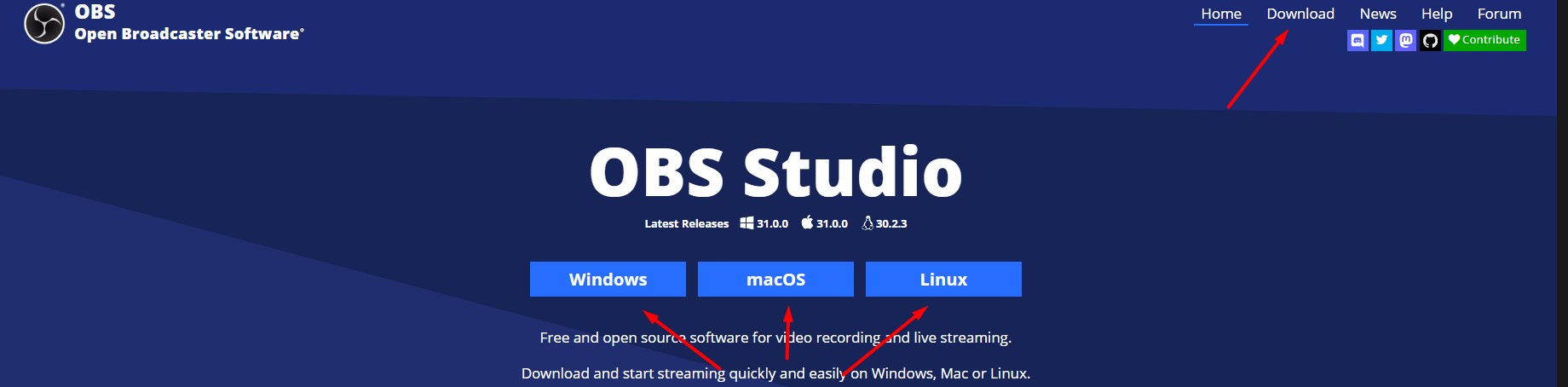 Зайдите на официальный сайт OBS Studio (obsproject.com) и скачайте программу для вашей операционной системы (Windows, macOS, Linux).