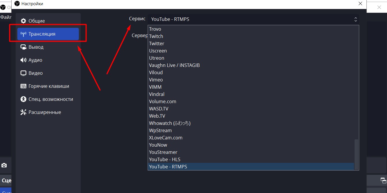 - В разделе «Настройки» → «Поток» выберите нужную платформу.