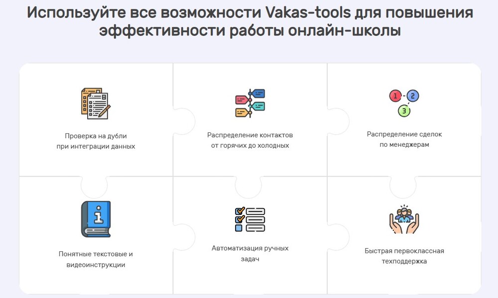 С помощью Vakas-tools можно интегрировать такие платформы, как GetCourse, amoCRM, Tilda, Bizon365, Битрикс24 и многие другие. С ним ваша работа станет намного более эффективной, продуктивной и предсказуемой!