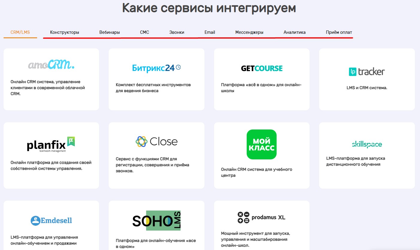 Сервис объединяет множество сервисов и платформ: Bizon365, Getcourse, amoCRM и Bitrix24 и др., в единую панель управления. Это упрощает обмен данными между инструментами и позволяет максимально автоматизировать бизнес-процессы.