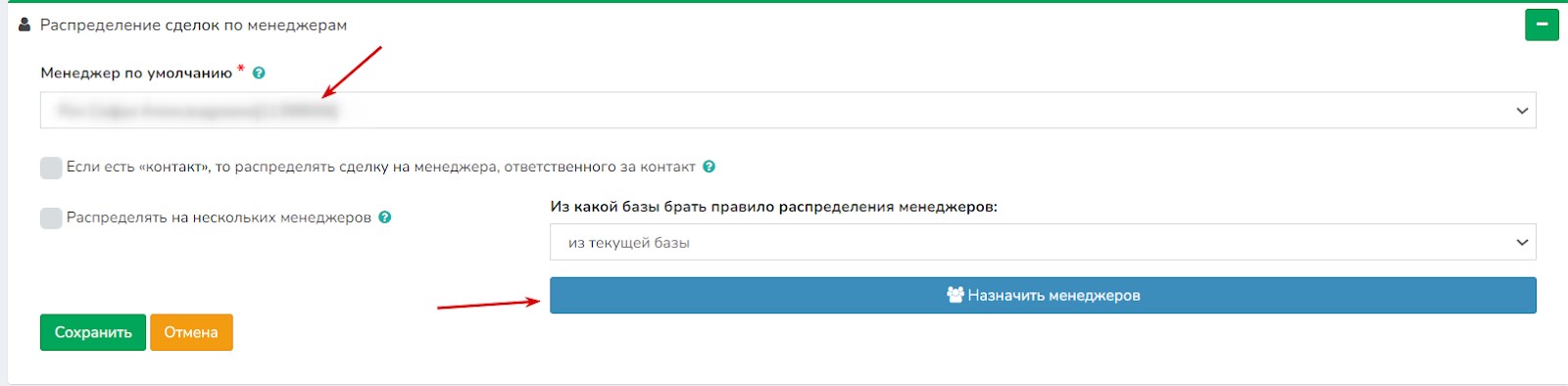 Проверьте настройки в разделах «Распределение сделок по менеджерам» и «Какие данные передавать в amoCRM». Убедитесь, что указанный менеджер активен.