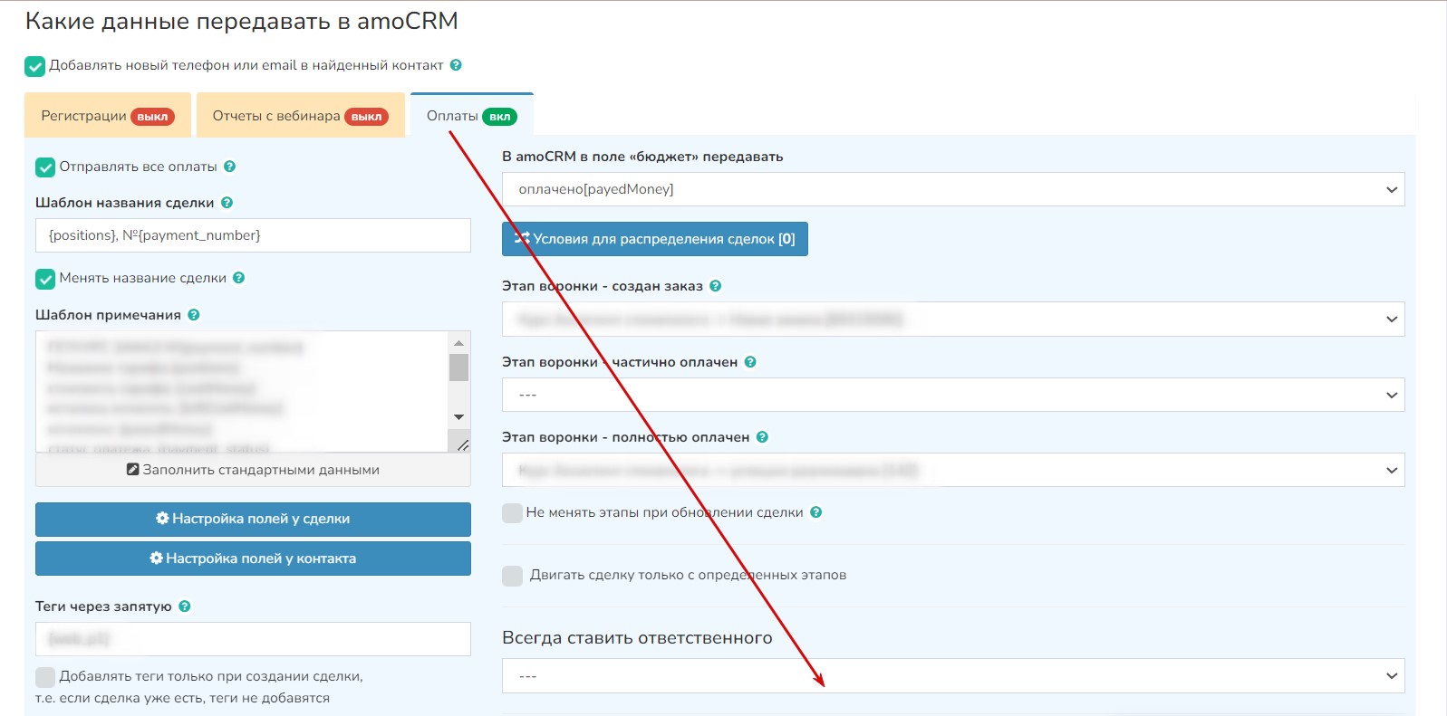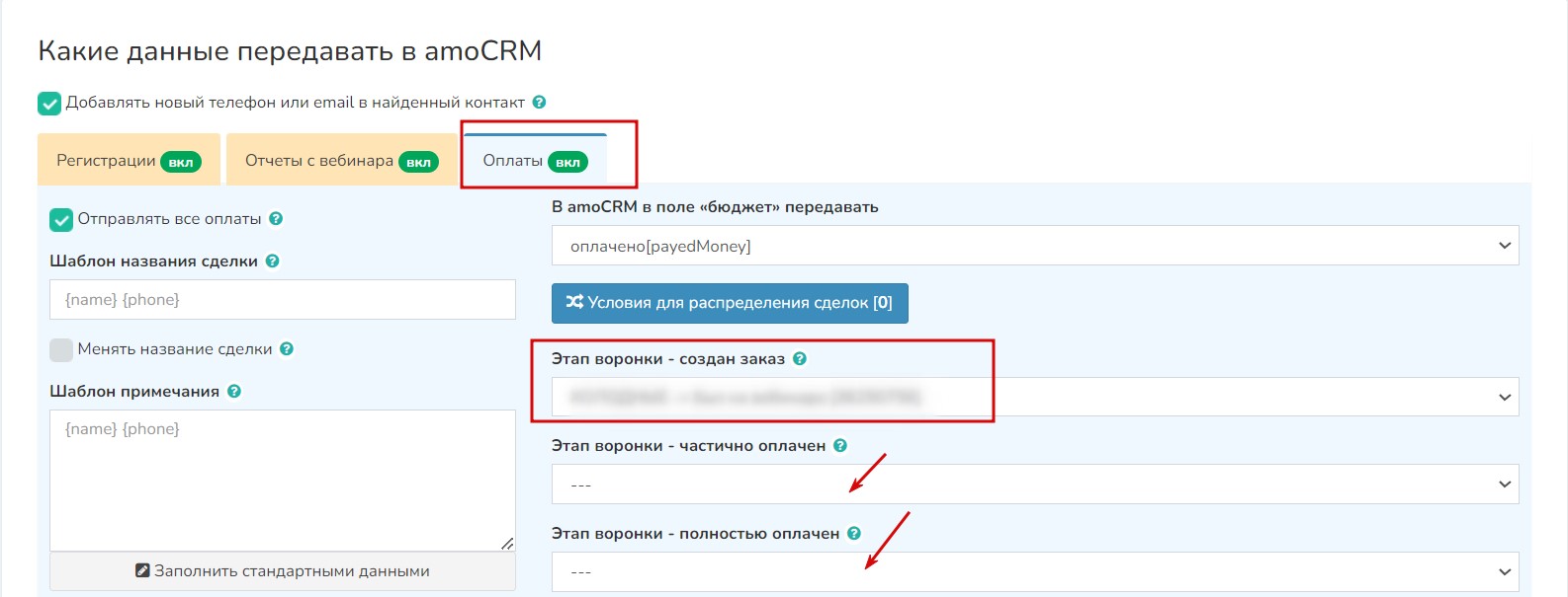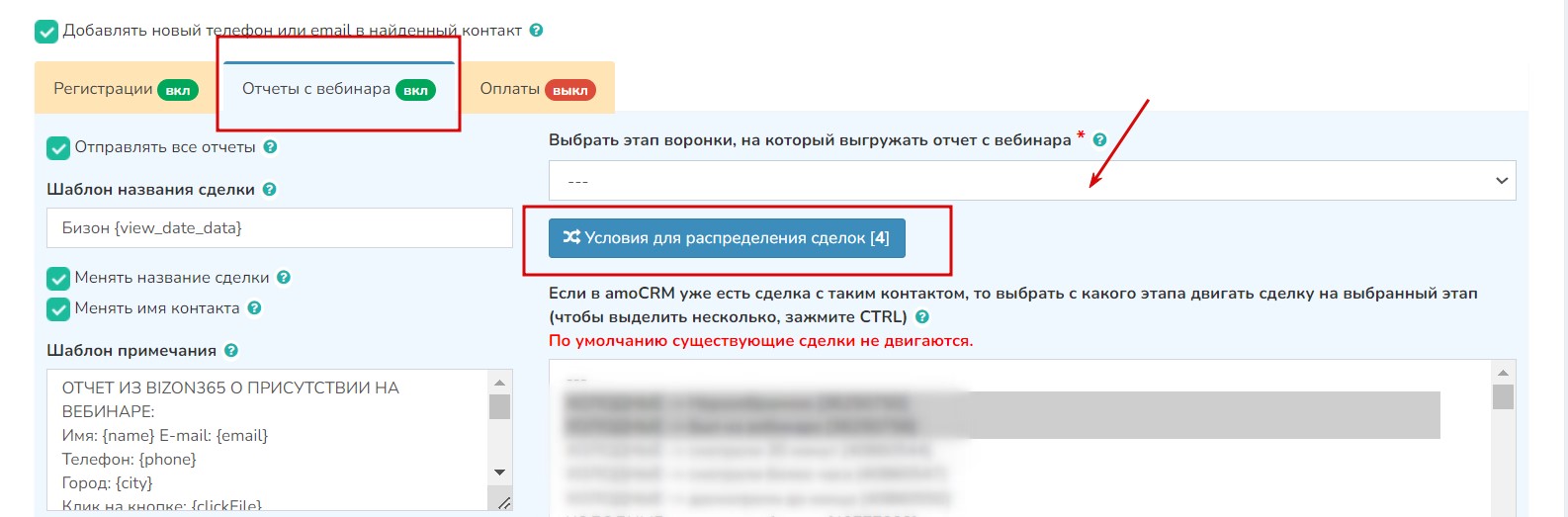 - При передаче отчетов условия распределения сделок по этапам могли быть настроены в зависимости от взаимодействия зрителя на вебинаре, при этом этап в amoCRM, в который направляются сделки, не был указан.