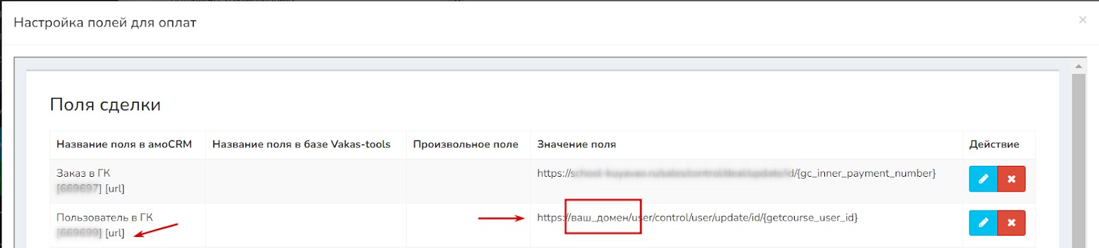 Это чаще всего бывает, когда при настройке полей для передачи оплат, у добавленных полей по умолчанию, не указывают в ссылке свой домен, в итоге ссылка остается в виде - https://[заменить на ваш домен]/user/control/user/update/id/{getcourse_user_id}