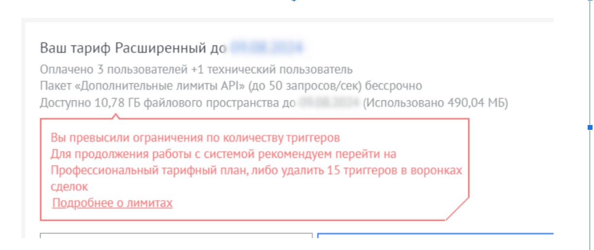 - Превышены лимиты в amoCRM на сделки, контакты или пользователей.