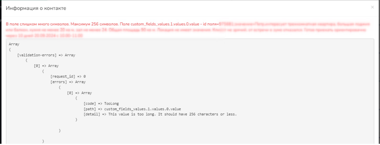 Передаваемые текст в поле amoCRM превышает 256 символов.