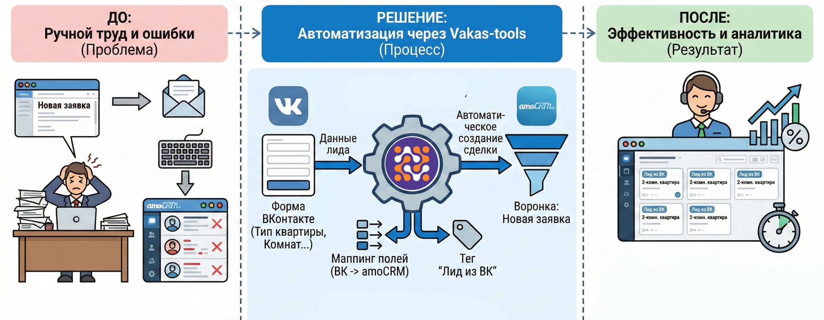 Кейс, где агентство недвижимости настроило автоматическую передачу лидов из VK в amoCRM и ускорило работу менеджеров почти вдвое.