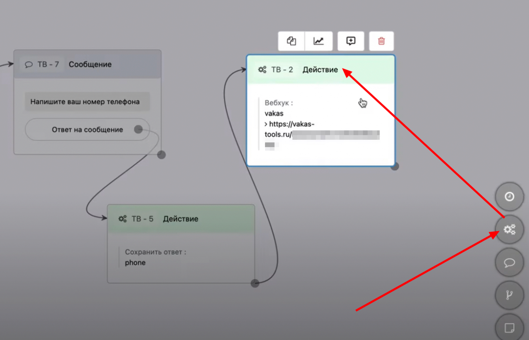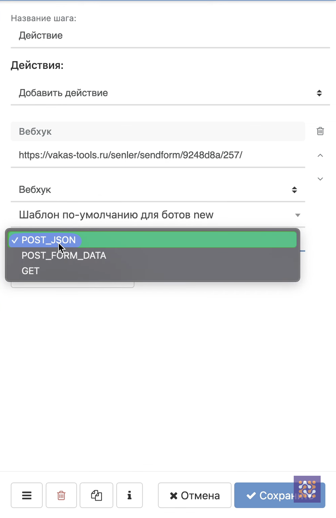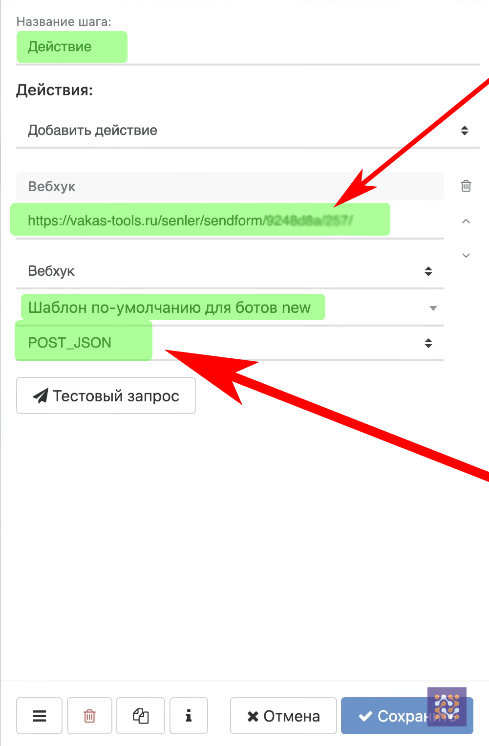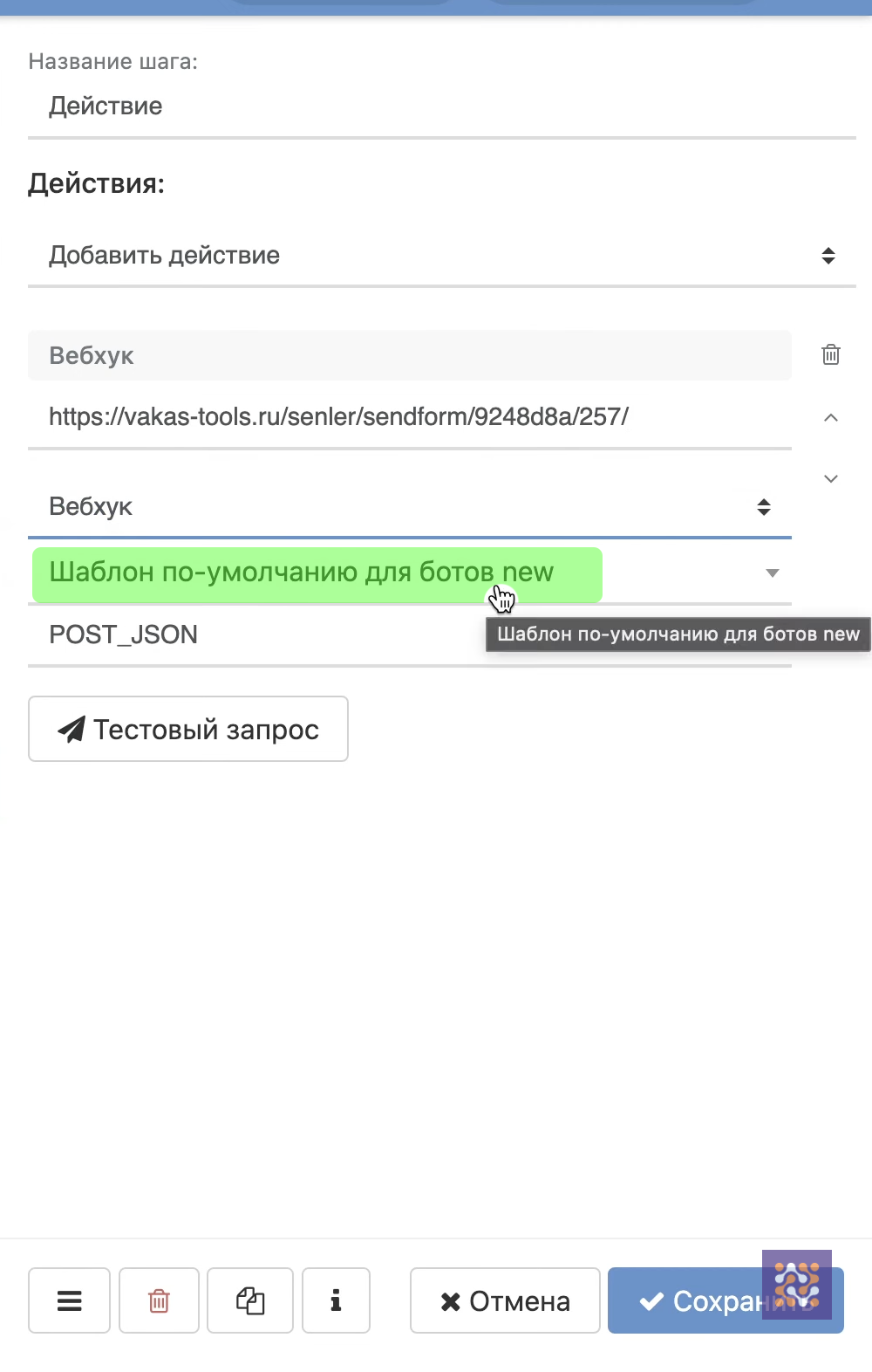 Пятый блок - «Действие» - Вызов вебхука: вебхук Vakas-tools;