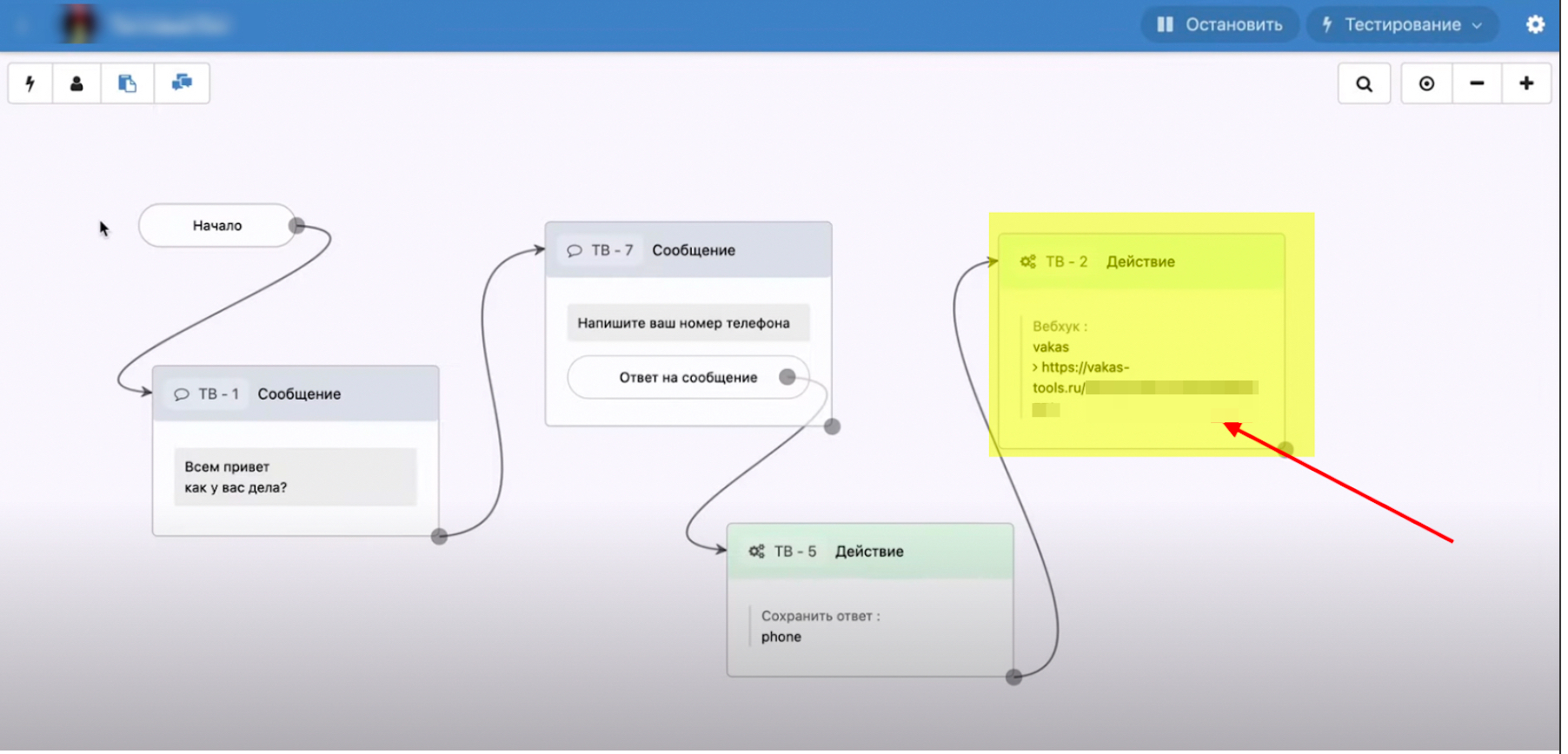 После того, как вы нажмете кнопку «Изменить», у вас откроется конструктор воронки. Здесь нужно после старта бота, запросить нужные вам переменные пользователя - номер телефона, почту и так далее, на нашем примере мы показываем, как после получения телефона пользователя, отправить его в базу Vakas-tools.