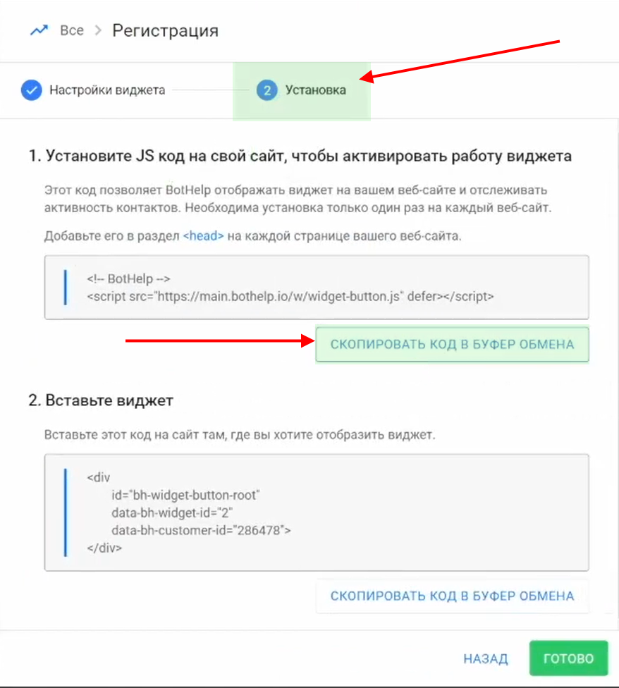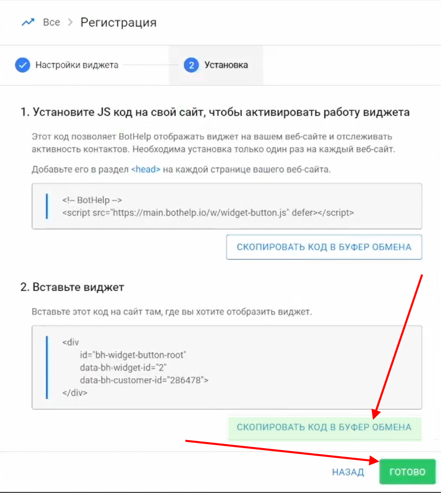 Вернитесь в BotHelp и скопируйте код виджета (отличается от кода активации).