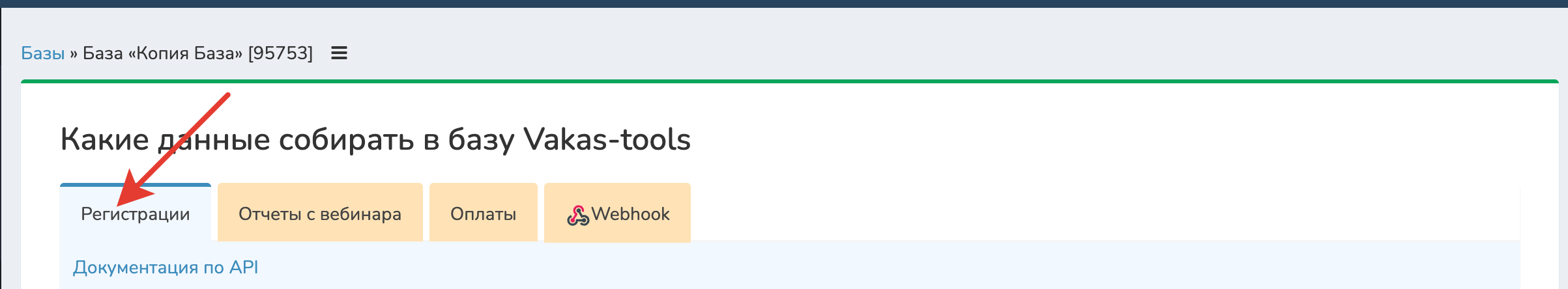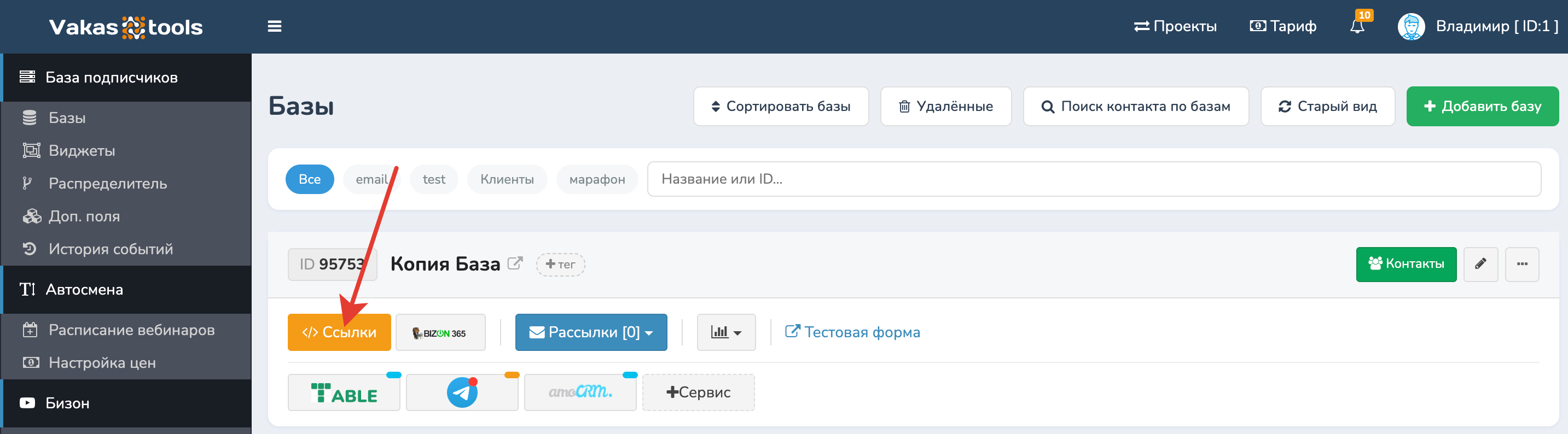 Скопируйте вебхук из Vakas-tools. Перейдите в «Базы» → «Ссылки».