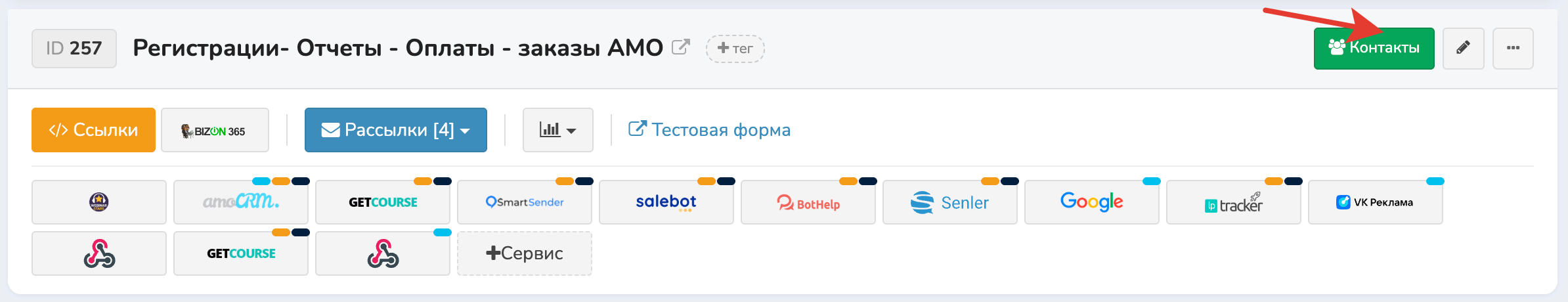 Передача данных настраивается через правила. На странице сервиса есть три вкладки: Регистрации, Отчёты, Заказы. На каждой вкладке — свой список правил.