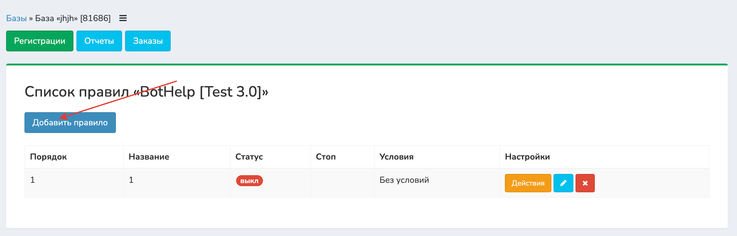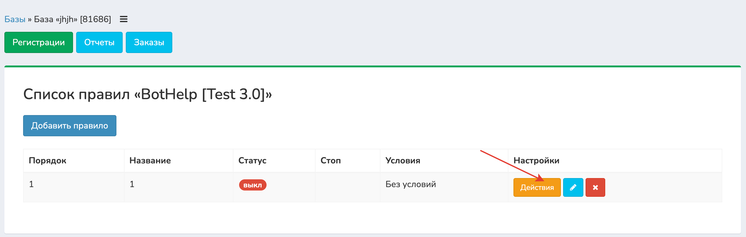 Нажмите «Действия» напротив созданного правила.