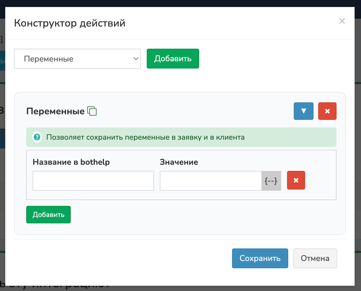 Нажмите иконку {--} рядом с полем значения, чтобы увидеть список доступных шорткодов. Названия переменных указывайте точно так же, как они созданы в BotHelp.