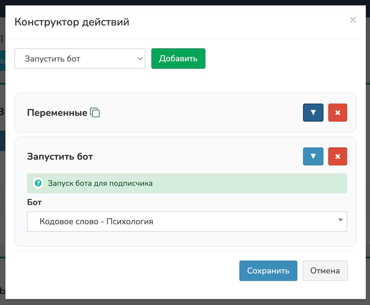 Нажмите «Добавить действие» → Запустить бот. Выберите бота из списка, например «Приветствие» или «Напоминание о вебинаре».