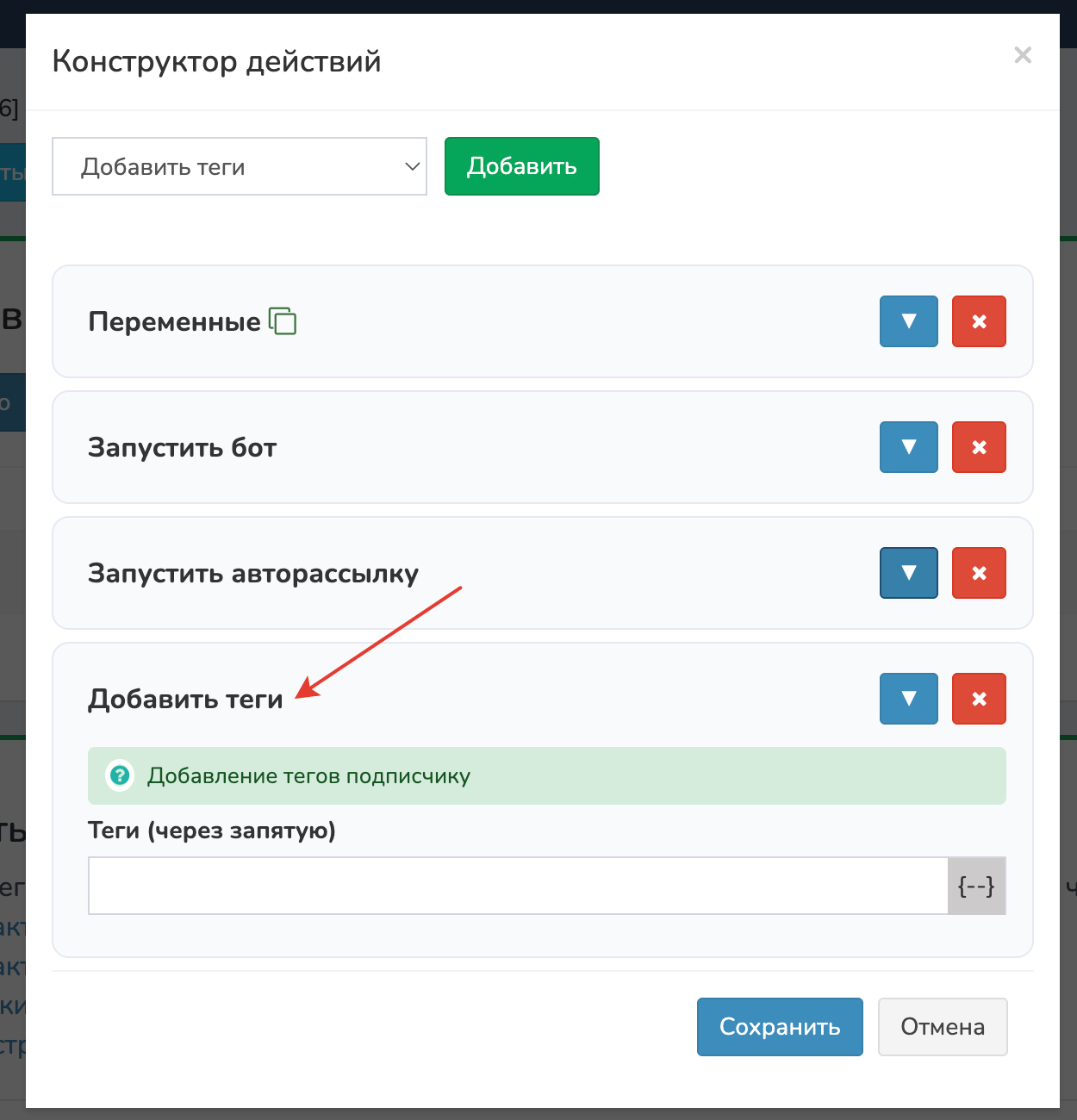 Нажмите «Добавить действие» → Добавить теги. Укажите теги через запятую, например: