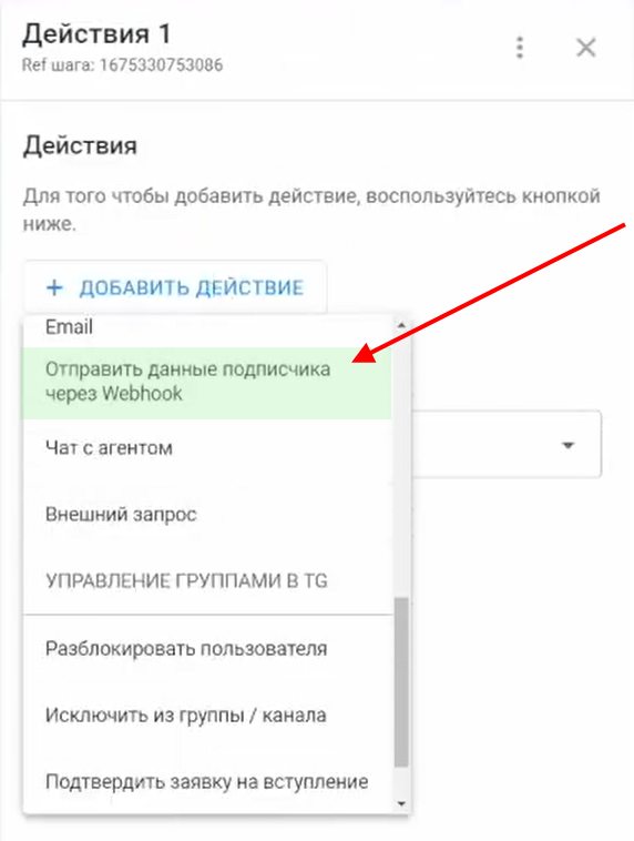 Выберите действие «Отправить данные подписчикам через Webhook».