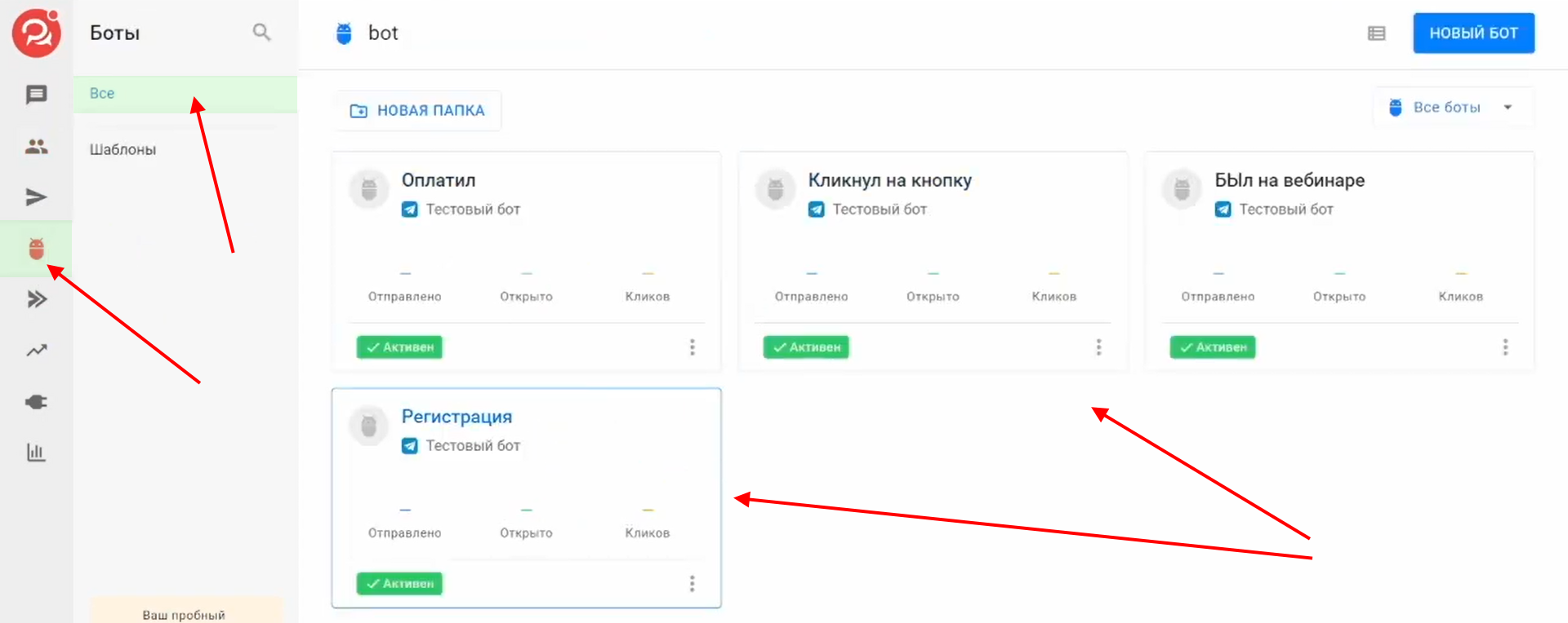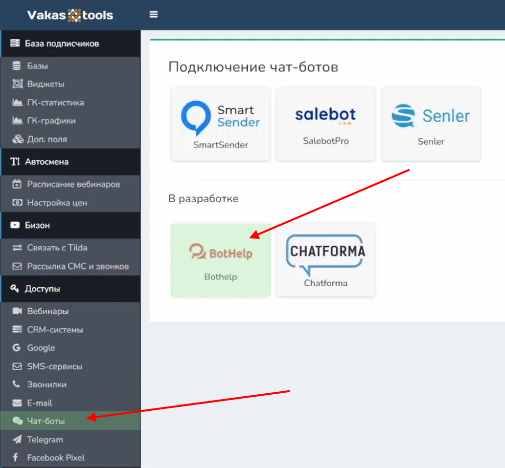 1 Настроим обратную передачу регистраций из Bothelp в Vakas-tools. Перейдите в Bothelp, в меню слева выберите «Боты»