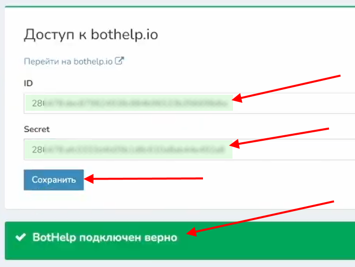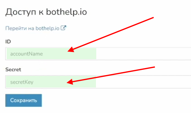 Для подключения к Bothelp требуется ввести ID и секретный ключ личного кабинета на Bothelp