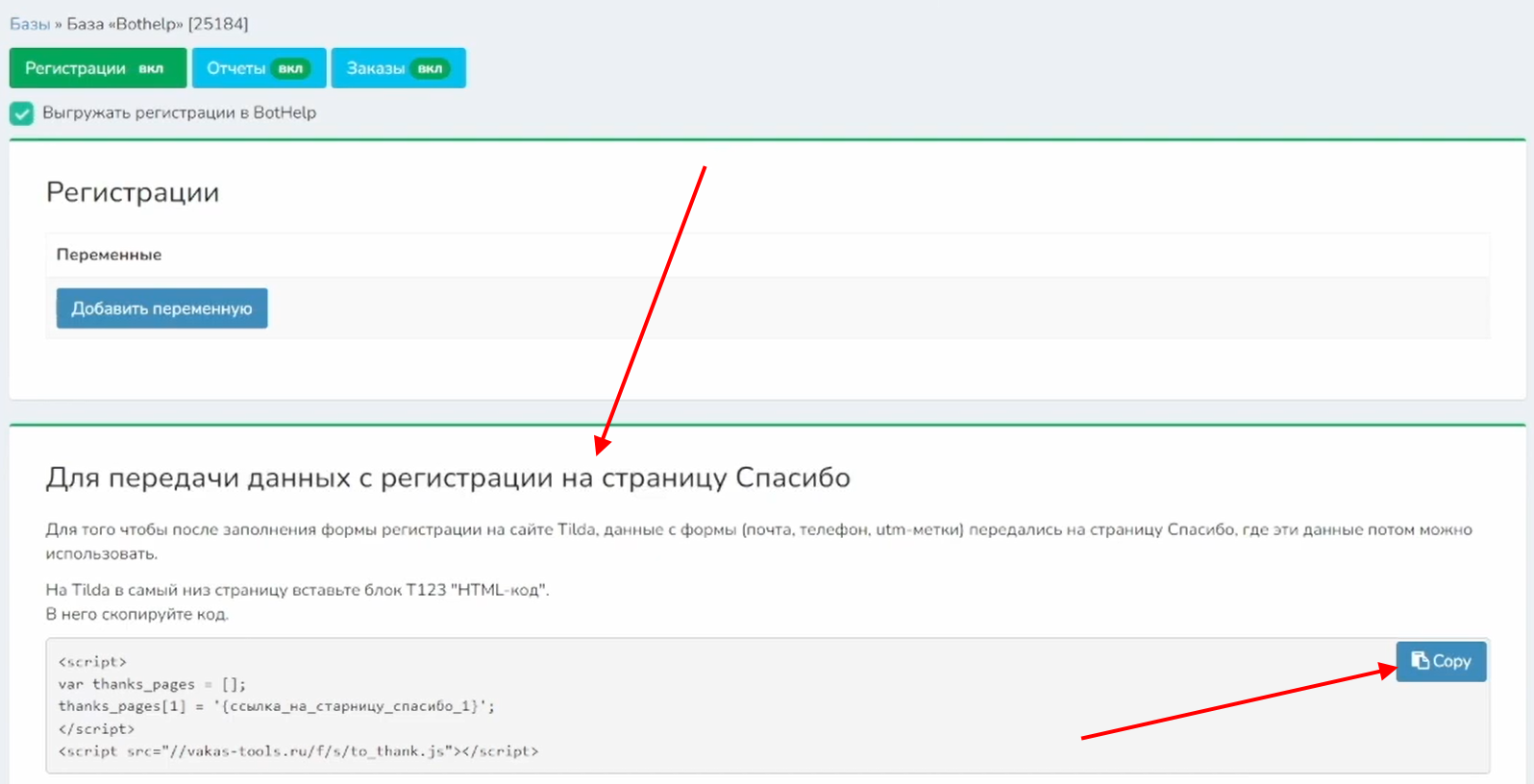 3 Настройте передачу регистраций в Vakas-tools с Bothelp ID, если данные о регистрациях собираются с лендинга (например, Tilda) и на нём есть страница, с которой лиды могут подписываться на бот